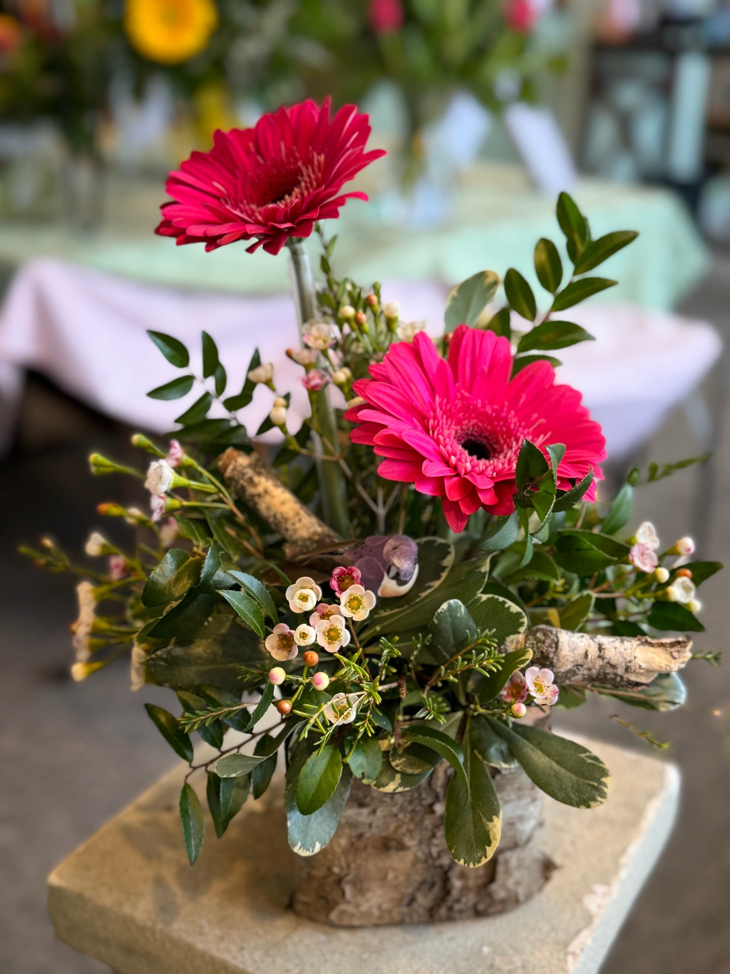 A compact and adorable arrangement with Gerbera Daisies surrounding a bird perched on a birch branch. These are typical style photos for reference.. what you actually receive may vary and/colors may be different but will still be beautiful.