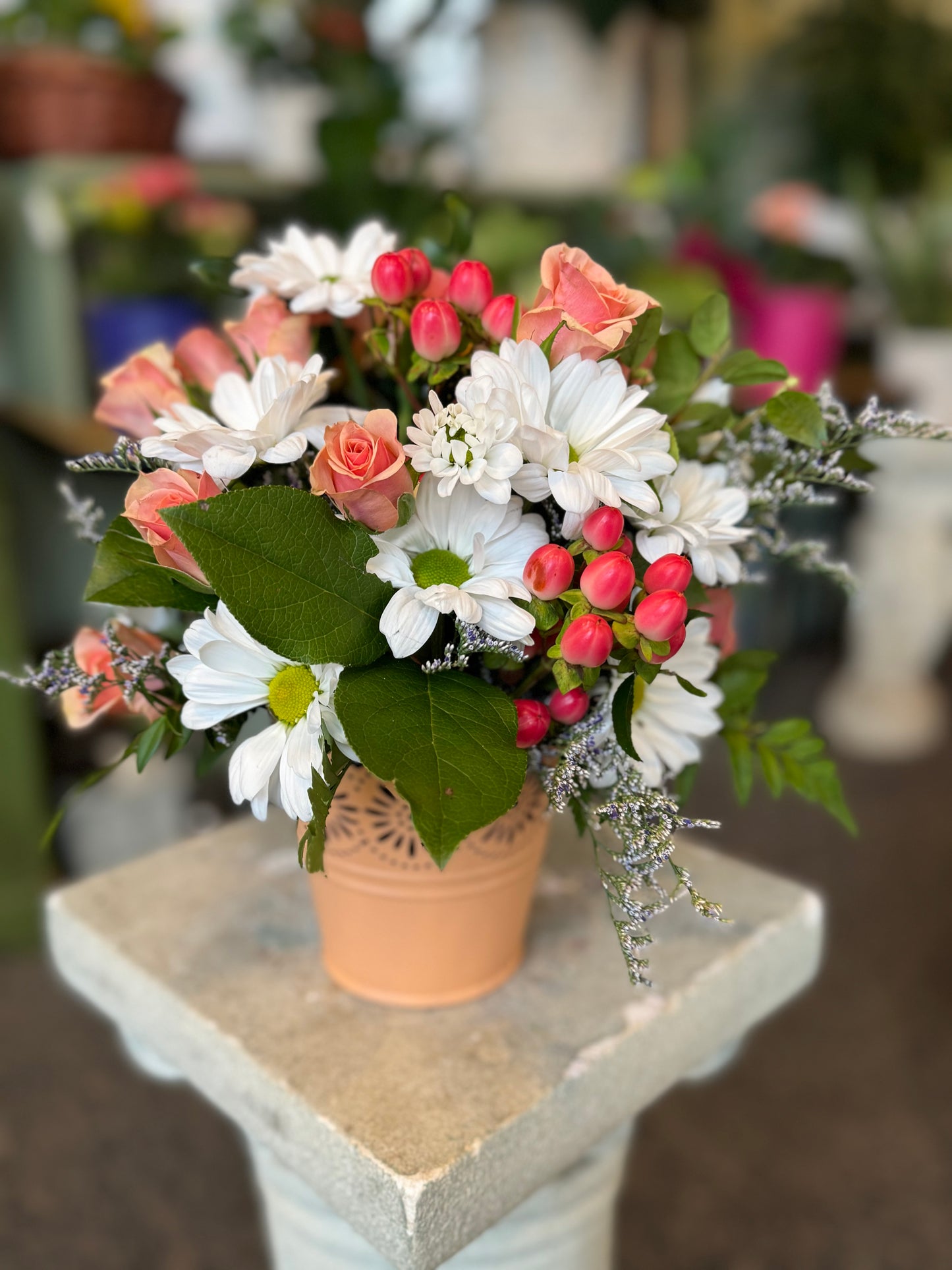 **A medida que cambian las estaciones y la disponibilidad de flores y macetas, nos esforzamos por recrear el diseño lo más fielmente posible, pero el resultado final puede variar con respecto a las imágenes de ejemplo. Tenga en cuenta que el diseño floral seguirá siendo espectacular una vez terminado.