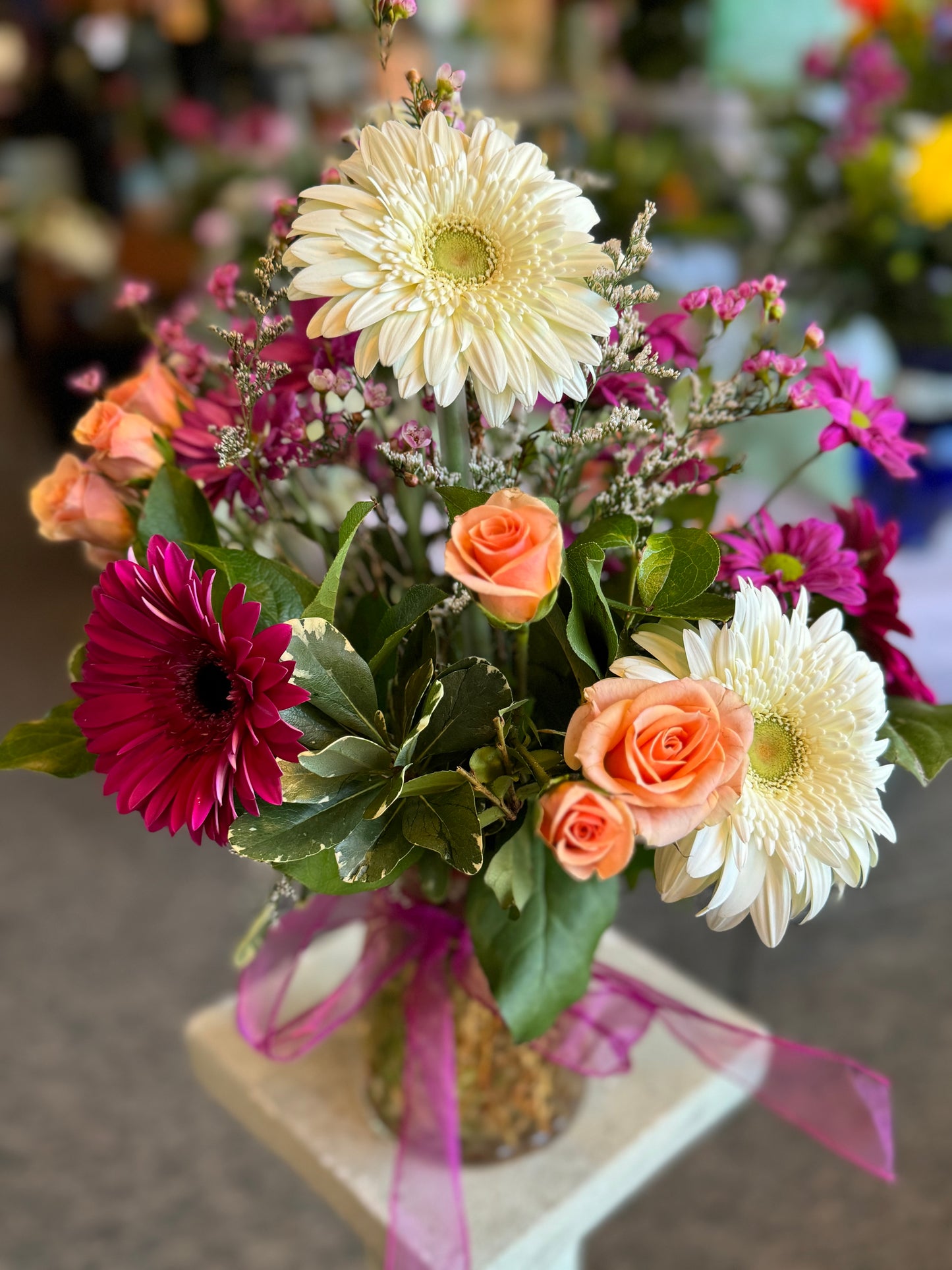 Ricos colores primaverales con verdes en un elegante jarrón pequeño.